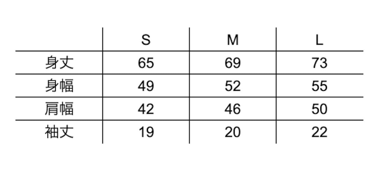 ・L:身丈73cm / 身幅55cm / 肩幅50cm / 袖丈22cm